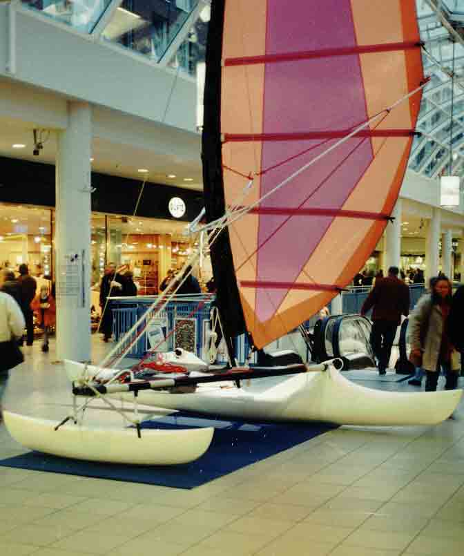 Prize awarded for design this 16 foot outrigger is located between catamaran, windsurfer and a dinghy.